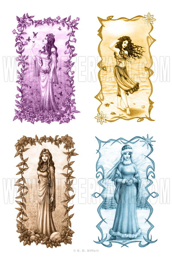 Desenhos e pinturas inspirados nas quatro estações do ano: primavera, verão, outrono e inverno. |